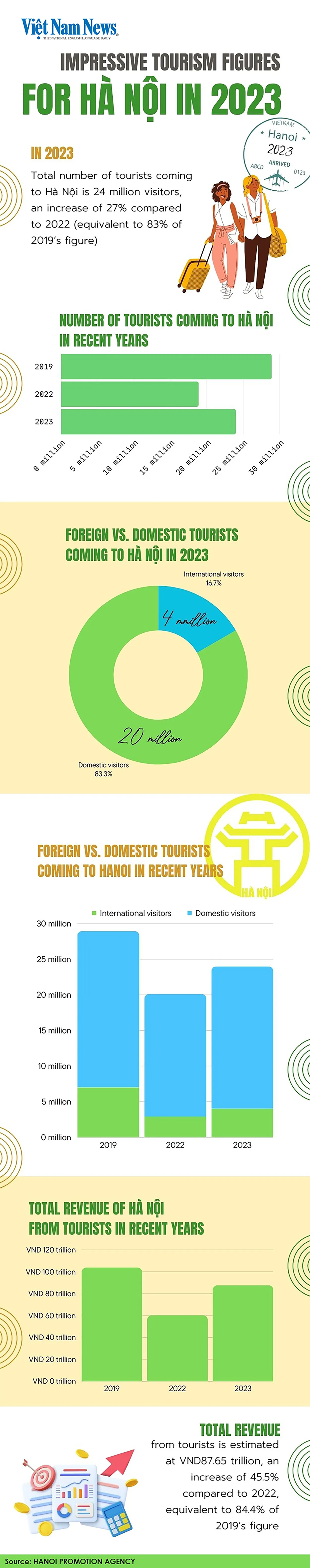 The surge in tourist numbers brought with it a significant economic boost for Hà Nội. Total revenue from tourists in 2023 is estimated at nearly VNĐ87.7 trillion (US$3.65 billion), marking a substantial 45.5 per cent increase compared to 2022. This remarkable economic recovery also translates to 84.4 per cent of the tourism revenue recorded in 2019, emphasising the resilience and adaptability of Hà Nội’s tourism sector in the face of adversity.